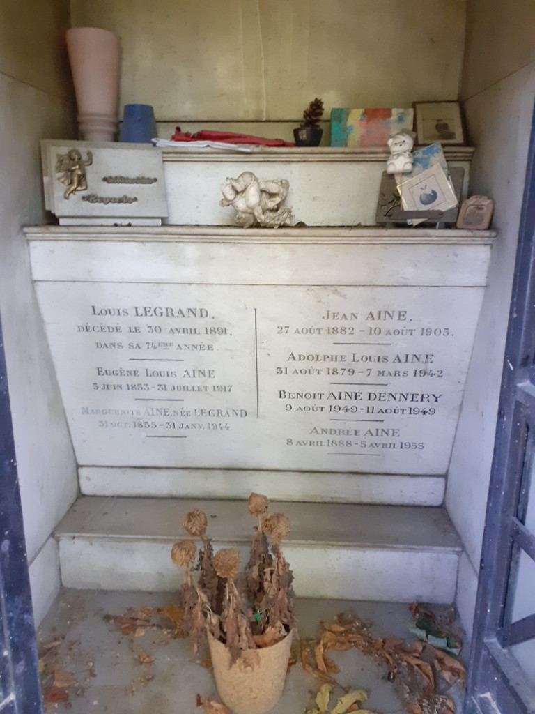 J’y ai trouvé uniquement la référence aux familles AINE et DÉTRIE ainsi qu’à Georges DÉTRIE, que je ne ne pensais pas trouver ici. Je m’attendais à une très vieille tombe de 1853, et nous avons découvert une tombe relativement récente. La dernière inhumation datant d’au moins 1952. Hélas, aucun des autres membres de la famille enterrés ici ne figurent sur la tombe, mis à part Georges DÉTRIE.